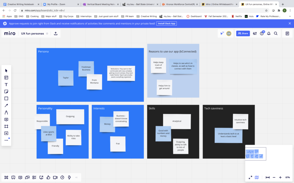After doing this this workshop, Cisna and I learned that there are a lot of benefits that come with it, for example, teams struggle to explain all that they do. It is easy to generalize it and say that “we make videos,” or “we design apps,” but really that is just barely touching the surface of the Corps. With the help of this workshop, students can now explain with a lot more detail what the teams do. For instance, the User Experience Team uses a method called “card-sorting,” which helps design the information architecture of a site, how the site’s information should be organized.