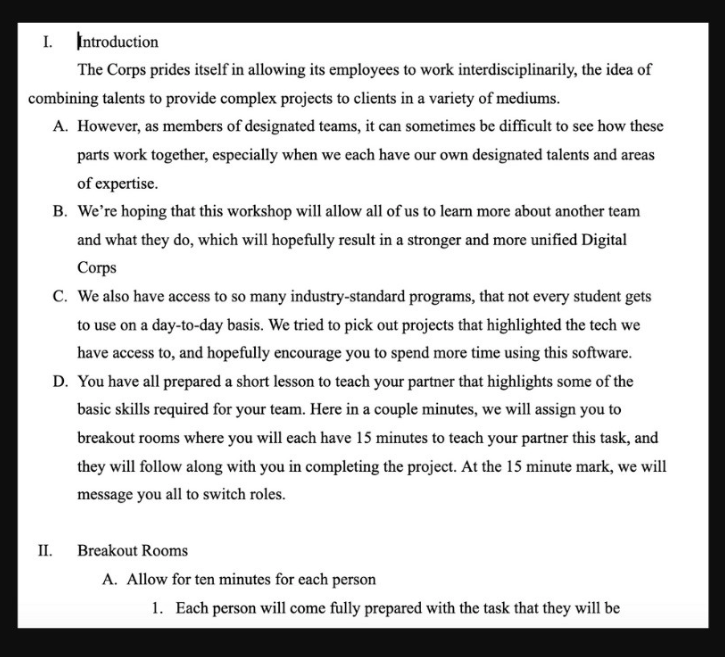 Our idea was simple: we wanted to host a skill session that would provide members of the Corps with the chance to gain a better understanding of what tasks each team does on a day-to-day basis. We then took our idea to the Basics Workshop team, which consisted of Hailey Leonard as the Junior Project Manager and Lauren Monasa as the Project Manager. Leonard explained that the purpose of doing basic workshops is “to allow students to learn the basics of a skill from one of their peers, and then hopefully go on to explore that skill in more detail after the workshop is done! It’s used as a learning opportunity for all the attendees, and a chance to practice leadership skills for the person leading the session!”