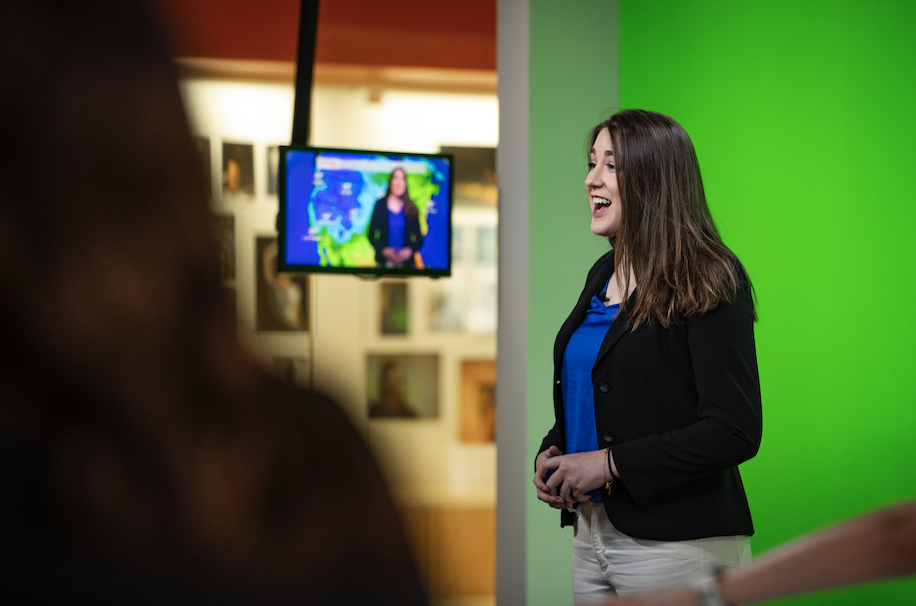 Similar to Smith, Esterle enjoys public speaking. She does weather forecasting for NewsLink Indiana, and as a master, she has presented at the Corps, including important presentations for the President’s Cabinet and the Board of Trustees. She can present in the same way her extroverted peers do, but she prepares differently. While extroverts do warmups and talk before presenting, Esterle finds that distracting. Instead, she prefers to energize herself by sitting alone and reflecting. For weather forecasting, this includes reviewing the data one last time.