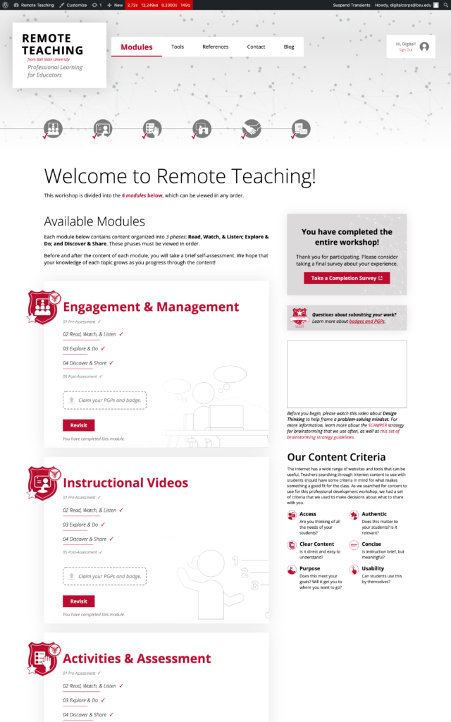 Students and staff worked together with faculty to plan an innovative and creative approach to tackle the topic of remote teaching. The Digital Corps planned and designed a complete website learning experience centered around six modules that cover different topics related to teaching from a remote setting.