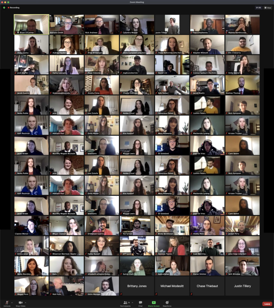 Though Zoom reactions can’t replace a good handshake, the Corps found digital ways to help foster and rekindle connections between students, staff, and alumni. Normally, graduating students would prepare presentations detailing their time at Ball State, the Corps, and their future plans to present in front of attendees. The Alumni Relations team wanted to keep as much of that experience as possible, and though bedroom workspaces aren’t as exciting as classrooms with projectors, the seniors still made the most of their fifteen minutes to shine.