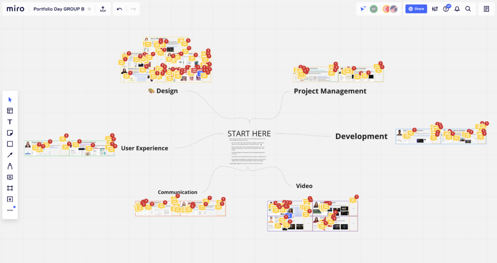 Remote technologies helped facilitate interactions and even made reviewing others’ work more efficient. Attendees left comments on the Miro boards, helping them organize their feedback and provided documentation for students to examine later. Initially, the Alumni Relations team planned to have participants leave comments in a designated space on the Miro board, but people left enough feedback to extend the borders of the comments section, and the final boards were peppered with valuable insights.