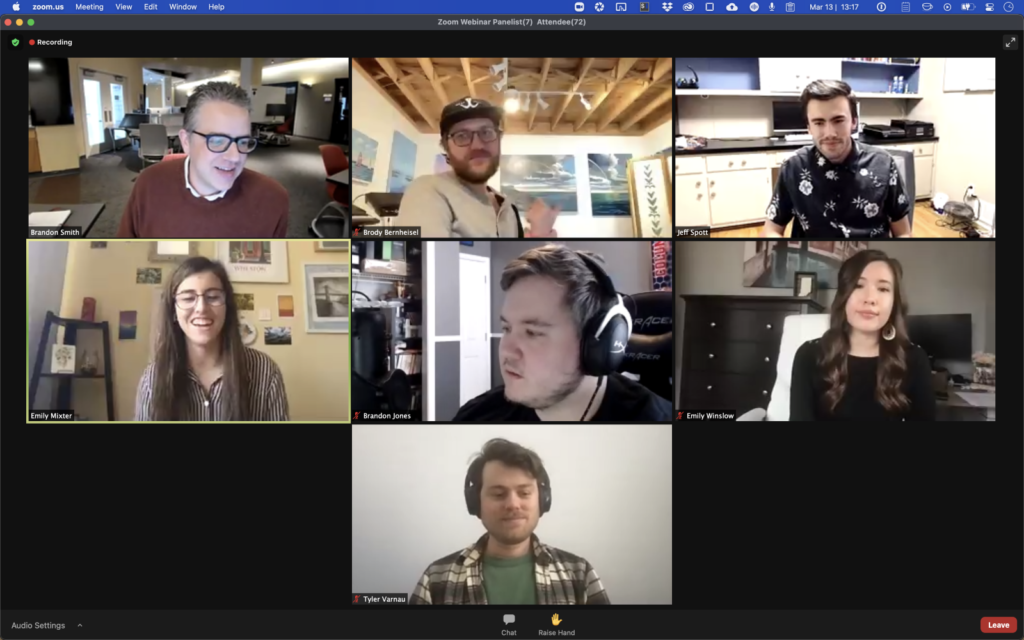 Alongside Bernheisel, Ball State alumni Jeff Spott (2018), Emily Mixter (2019), Brandon Jones (2009), Tyler Varnau (2014) and Emily Winslow (2019) brought their expertise to the virtual table for the Corps’ first Portfolio Day alumni panel. The panelists led a helpful discussion, touching on moving to new cities, promoting professional skills, finding work as a recent graduate, and passionately pursuing dreams.
