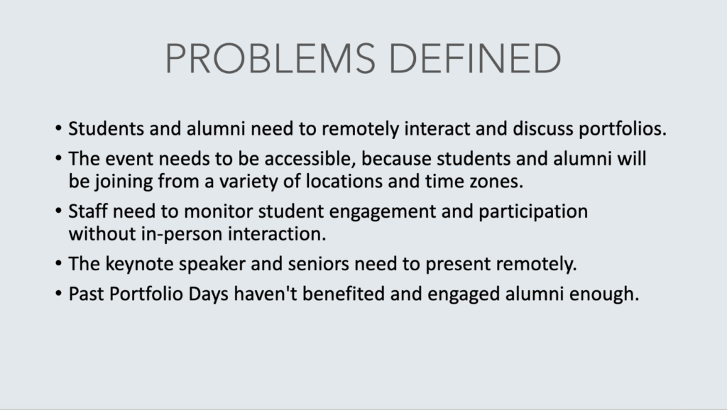 With the overarching goal of connecting current students with industry professionals, the Alumni Relations team had the opportunity to reimagine what Portfolio Day could be. Months of research and planning went into the event, from an initial pitch presentation to weekly brainstorming sessions. With the combined knowledge of project managers, designers, videographers, strategic communicators, and user experience researchers, the team put together a pitch detailing potential problems and creative solutions. The team considered online logistics, how to keep participants engaged, and even how a digital format could improve the event, all while thinking about the needs of both young and experienced professionals.
