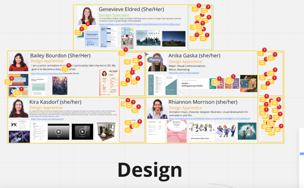 The team needed to find a way for everyone to interact and view the multitude of student portfolios. Normally, Corps members would set up their work in small stations and attendees would peruse the room and give feedback, akin to a science fair, but with laptops instead of trifold boards. To emulate the fluidity of this session, the Alumni Relations team chose to use the digital whiteboarding technology, Miro. Video Team Master Brittany Jones prepared a template with spaces for student names, brief bios, photos of work, personal Zoom links, and links to websites and reels. Jones refined the template into an easy-to-navigate display of student success with the help of Dawson and Design Apprentice Megan Huss.